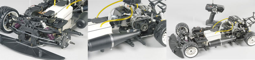 The models are built on a 4mm alloy chassis with double wishbones at front and rear axle. All borings of the alloy chassis are countersunk to prevent the screw heads from bearing out. The models are serial equipped with the 2-damper front axle which guarantees an optimal traction of both front wheels. At the front/rear axle you can adjust through track rods or adjusting screws with right-/left-handed thread the king pin angle, trailing effect and toe-in. Further equipment points are front disk brakes, differential gear, easy-running FG ball drive, alloy brake calliper with big brake disk, stabilizer bar front and rear, tuned pipe muffler, Evo gas tank, rear brace, 24T steel pinion, spark plug cap suppression cover, latest version (Evo) oil-pressure shock absorbers with volume control and external adjusting ring for the initial spring preload. All rotating parts as shafts, axles and clutch bells a.s.o. are supported by ball bearings.
